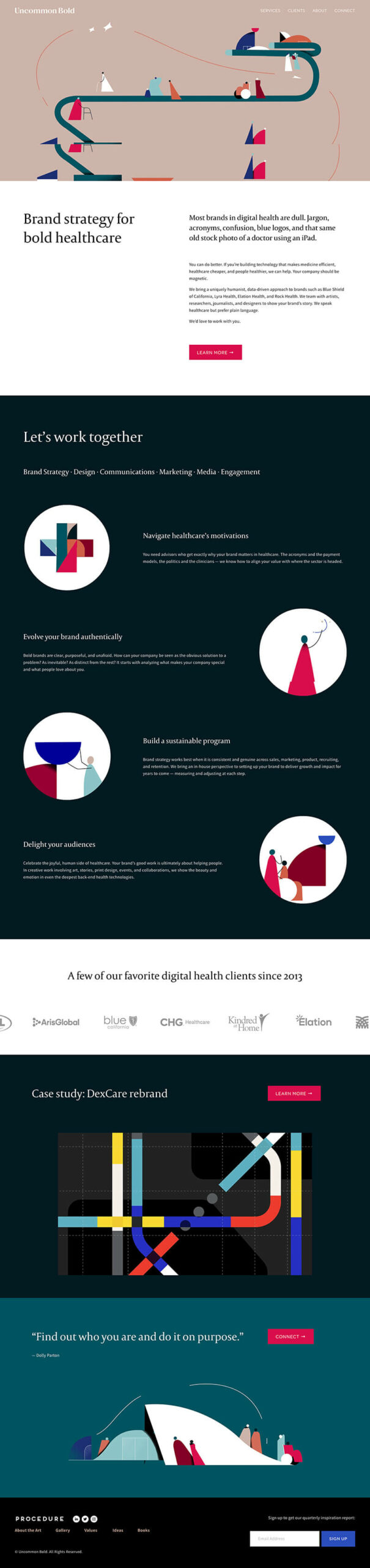 Uncommon Bold disposait d’un site qui ne reflétait plus l’évolution du studio ni la sophistication de ses projets dans le domaine de la santé. Le contenu était dispersé, les messages manquaient de clarté et la structure ne mettait pas suffisamment en valeur la profondeur de leurs services, leurs expertises stratégiques et leurs études de cas. À mesure que l’équipe grandissait et que les missions devenaient plus complexes, le site ne soutenait plus leur positionnement premium ni leur storytelling. Ils avaient besoin d’une plateforme capable d’illustrer leur approche audacieuse, de renforcer leur crédibilité auprès de leurs clients et prospects, et d’offrir une expérience fluide qui traduise à la fois leur rigueur, leur créativité et leur impact dans le secteur de la santé.