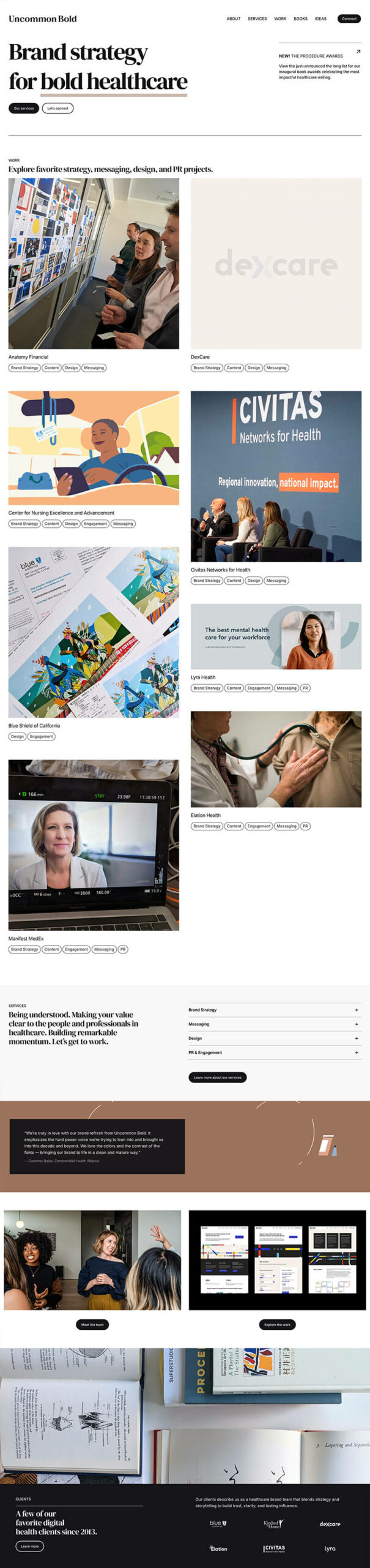 Uncommon Bold disposait d’un site qui ne reflétait plus l’évolution du studio ni la sophistication de ses projets dans le domaine de la santé. Le contenu était dispersé, les messages manquaient de clarté et la structure ne mettait pas suffisamment en valeur la profondeur de leurs services, leurs expertises stratégiques et leurs études de cas. À mesure que l’équipe grandissait et que les missions devenaient plus complexes, le site ne soutenait plus leur positionnement premium ni leur storytelling. Ils avaient besoin d’une plateforme capable d’illustrer leur approche audacieuse, de renforcer leur crédibilité auprès de leurs clients et prospects, et d’offrir une expérience fluide qui traduise à la fois leur rigueur, leur créativité et leur impact dans le secteur de la santé.